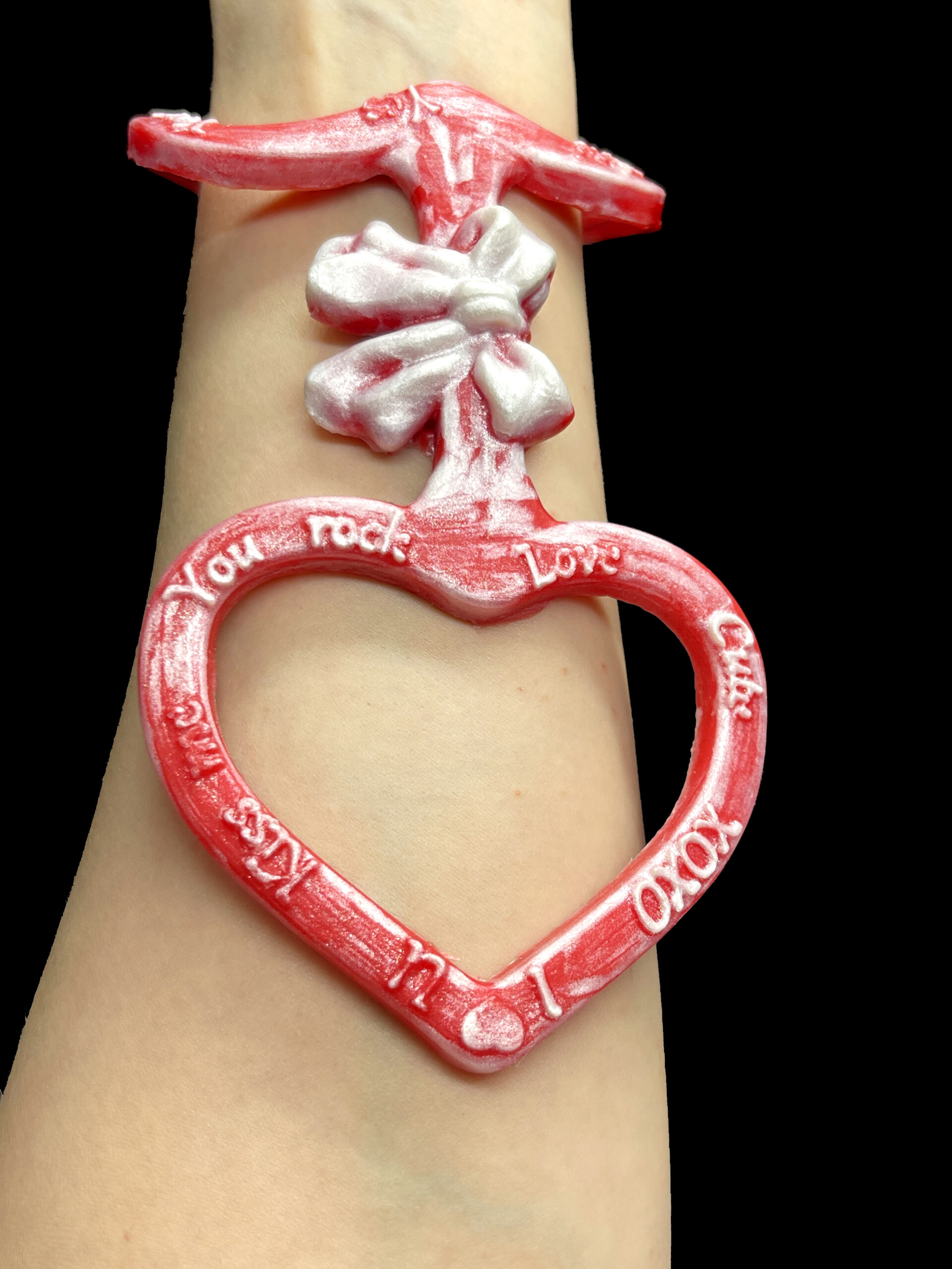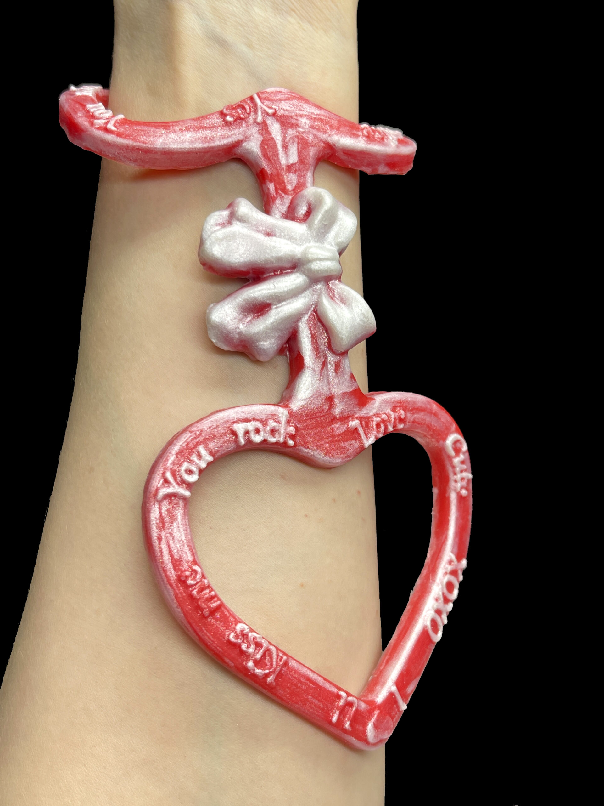 Each pair is detailed with fun, uplifting phrases such as “I Love You,” “You Rock,” “Kiss Me,” “XOXO,” “Hug Me,” and more. These positive messages give the accessory a cheerful, candy‑inspired aesthetic that stands out in photos, themed outfits, and creative videos.